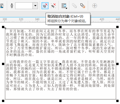 3. 使用“选择工具”挪开上面的冻结之后的文本(如果不想挪动位置,可用Tab键查找),然后删除以前的文本,选取冻结之后的物件,点击菜单栏中“取消组合对象”按钮。