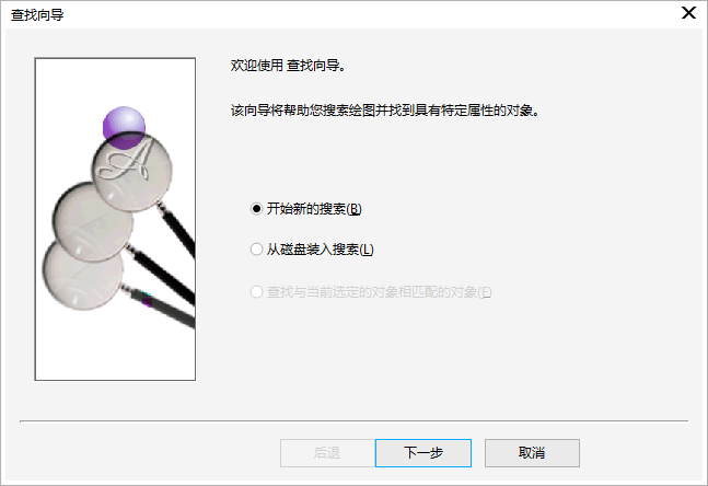 1. 执行菜单栏“编辑>查找并替换>查找对象”命令。在弹出的“查找向导”对话框中,选择第一项“开始新的搜索”,单击下一步。