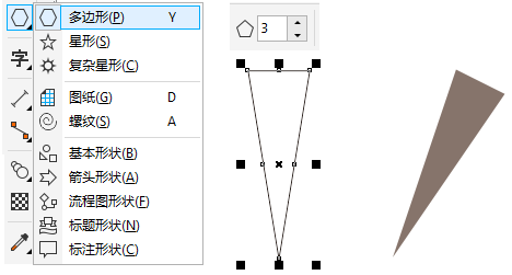使用"多边形工具"设置变数为3,按住鼠标左键从下往上绘制三角形,去除轮廓填充深褐色。