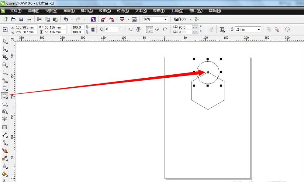 3、接着按住ctrl键,在页面上绘制一个正圆图形,并且把正圆移动到正六边形上面,让正圆的中心点与正六边形的其中一个顶点相重合