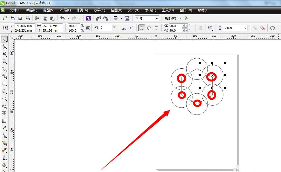 4、再复制五个正圆,分别移动到正六边形剩下的五个顶点处,中心点都与顶点重合