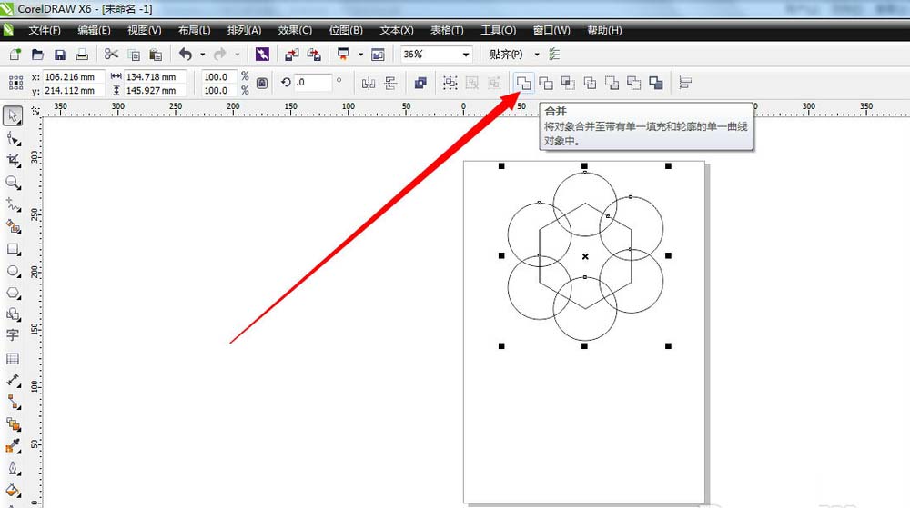 5、把页面上的所有正圆、六边形图形一起选中,点击工具栏里的“合并”图标按钮