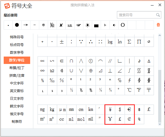 如果安装了搜狗输入法,按下Ctrl+Shift+Z搜狗输入法的符号大全,在“搜索符号”框中键入“人民币”或“美元”则会自动搜索,如下图,在搜狗输入法的符号大全的“数学/单位”中找可以找到钱币符号。