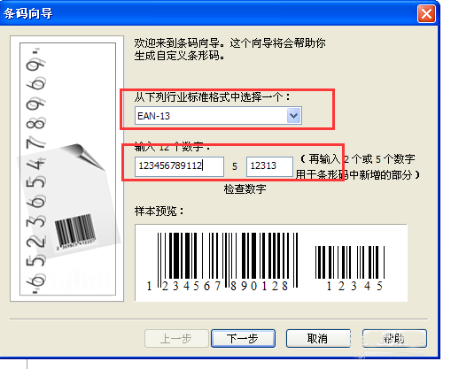 5、然后我们选择EAN13,因为这个通用于全世界,下边的数字我们可以任意写,我们做测试嘛