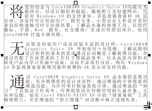 1. 使用F8“文本工具”,在CDR绘图区域拖动鼠标实现段落文本框,在框内单击添加段落文字,或者也可以从已有文字中复制文本到文本框。如图所示,我们可以看到段落文本的右边参差不齐。