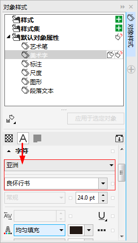 3. 选择“美术字”之后,对象样式面板会针对美术字的设置展开一系列选项。选择字符属性,然后更改“全部脚本”改为“亚洲”(这样是为了方便查找),字体根据喜好自行选择,这里以“良怀行书”为例。“美术字”默认字体设置完毕。
