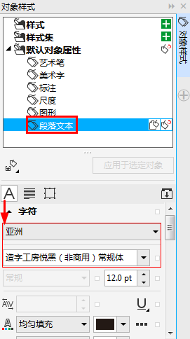 2. 单击展开“默认对象属性”选项,在这里可以分别设置“美术字”和“段落文本”,首先选择“美术字”进行设置。