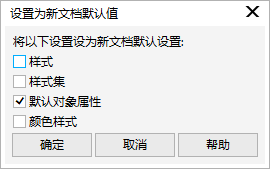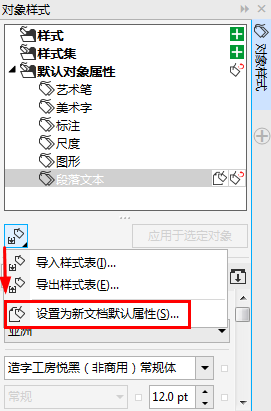 5. “美术字”和“段落文本”设置完毕后,点击“导入、导出或保存默认值”按钮保存为“设置为新文档默认属性”。