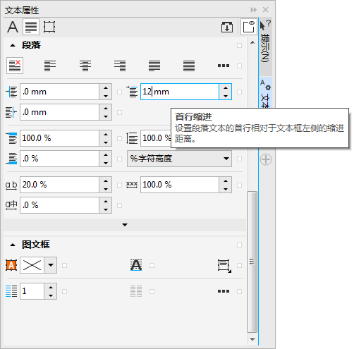 2. Ctrl+A全选所有文字,点击菜单栏“文本属性”按钮(快捷键Ctrl+T)。在弹出的“文本属性”面板中选择“段落”属性,设置“首行缩进”量,如图所示。
