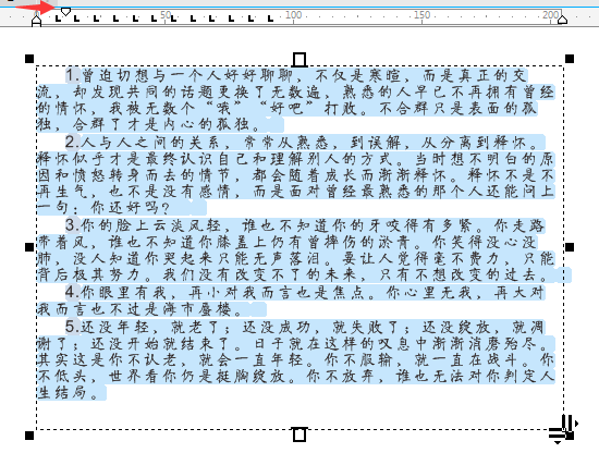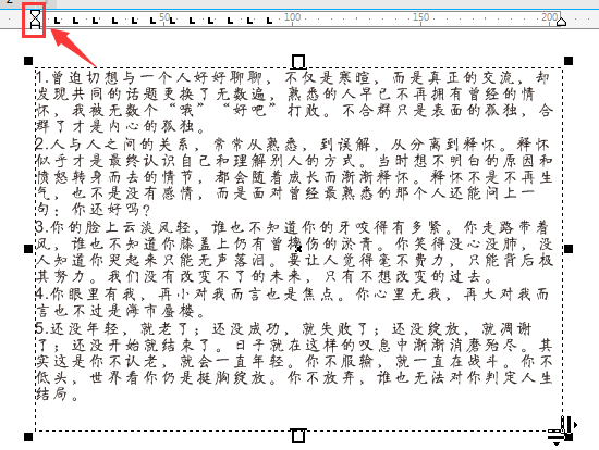 1. 使用F8“文本工具”,在CDR绘图区域拖动鼠标实现段落文本框,在框内单击添加段落文字,或者也可以从已有文字中复制文本到文本框。如图所示。