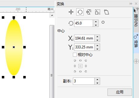 3. 选中图形,再次单击,四周出现旋转箭头,将旋转中心点垂直向下移动,执行“窗口>泊坞窗>变换>旋转”操作(快捷键是Alt+F8),在右侧弹出的面板中选择“旋转”命令,设置旋转角度为45度,副本为7个,单击应用按钮。