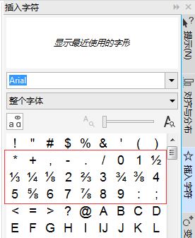 2. 在界面右侧会弹出“插入字符”面板,在“插入字符”泊坞窗中出现各种各样的符号字符,首先能够看到的就是分数字符。