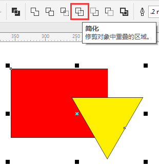 2. 使用“选择工具”框选两图形,点击属性栏中的“简化”按钮,即可修剪对象中的重叠区域。简化对象时无关先后选择顺序,您可以框选,也可以按住Shift加选,最后简化出来的效果都是一样的。