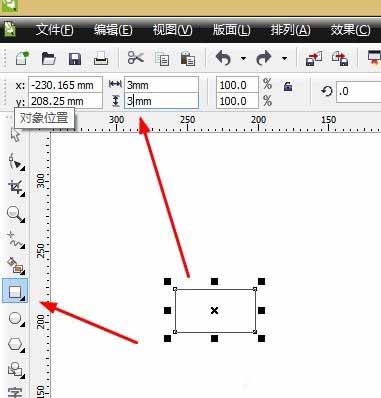 5、下一步在矩形那里点击画一个矩形然后在纸张宽度跟高度那里设置为3毫米,出现一个3毫米的小矩形,把它点一下弄成编辑状态出现“十”字形