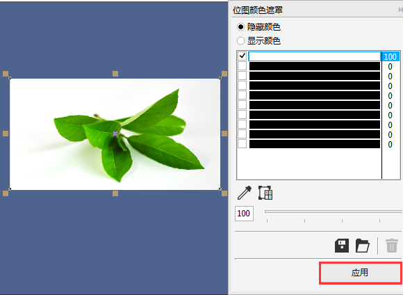 2. 选中图片,点击“位图>位图颜色遮罩”命令,在“位图颜色遮罩”泊坞窗中,选中“隐藏颜色”单选按钮,在下面的颜色列表中选择第一个颜色条,将其勾选,在列表下面单击“吸管”按钮,吸取位图中想要遮罩掉的色彩部分,移动“容差”值滑块,单击“应用”按钮。