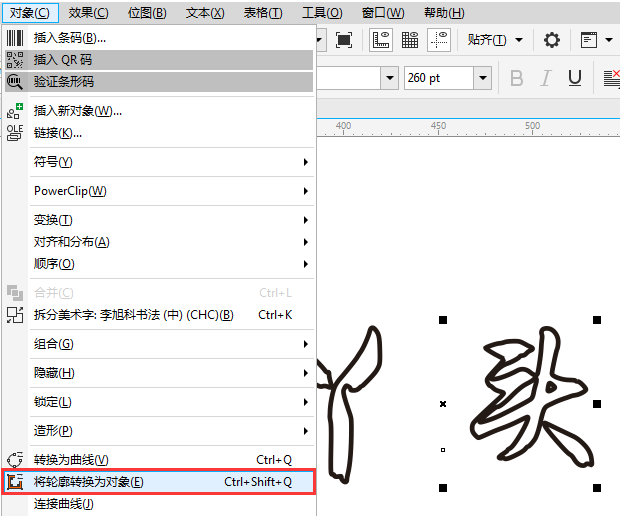 3. 选中文字,点击菜单栏的“对象”,选择“将轮廓转换为对象”命令(快捷键‘Ctrl+Shift+Q’)。