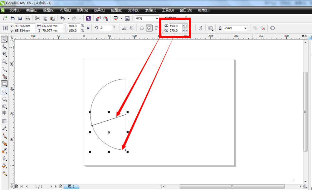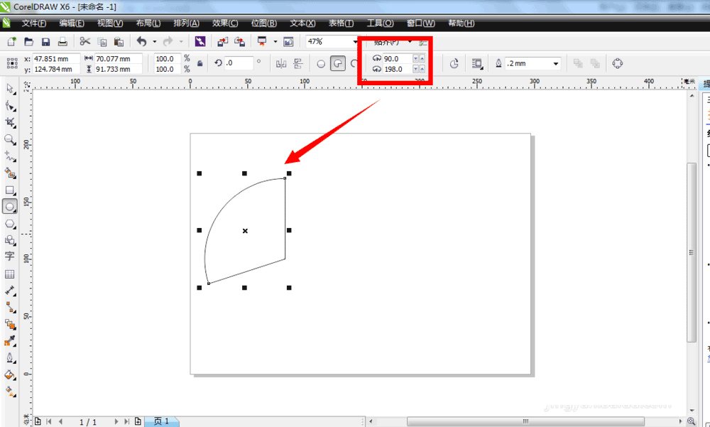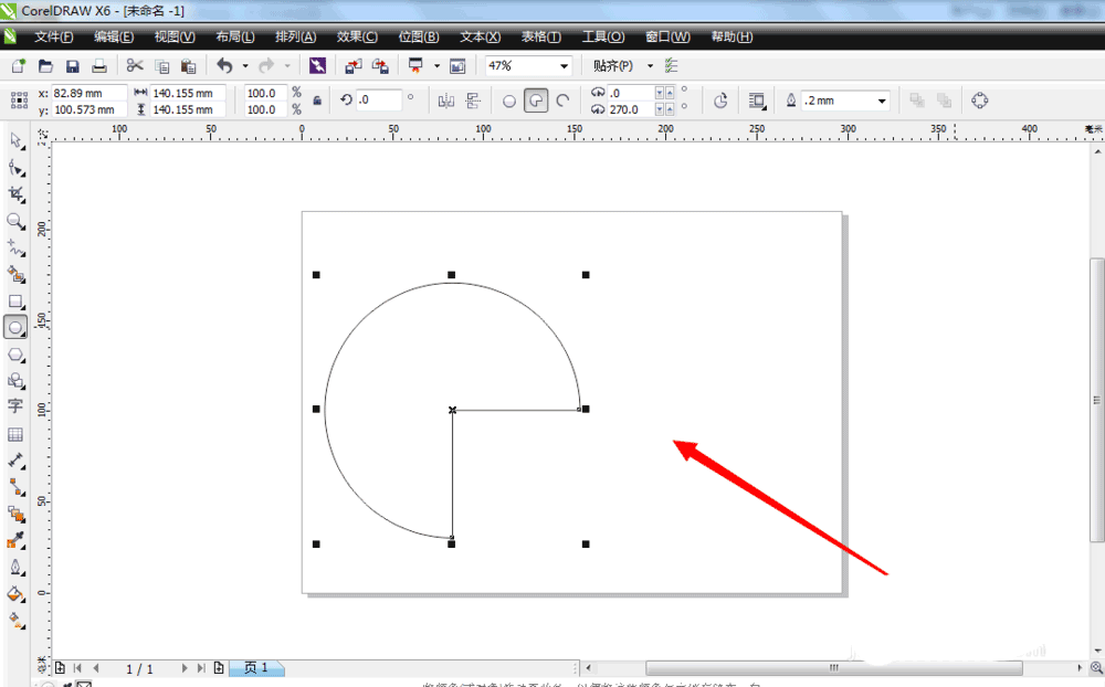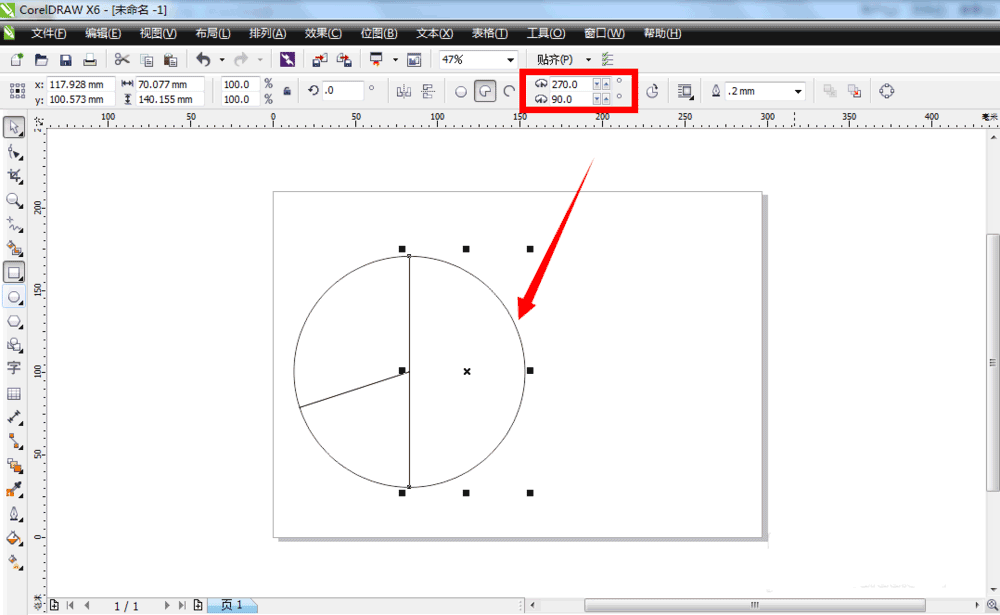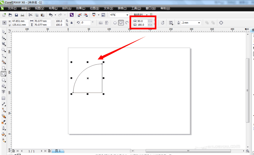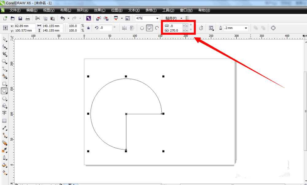 5、比如,我们设置开始角度为90°,结束角度为180°,就可以得到如图所示的四分之一的圆。