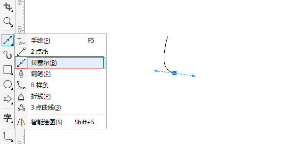 1. 打开CorelDRAW X8软件,新建文档,选择工具箱中的“贝塞尔工具”,在绘图区域,鼠标右键点击定点,然后移动鼠标到适当位置拖动拉出手柄得到一条曲线时释放鼠标,得到下图所示曲线路径。