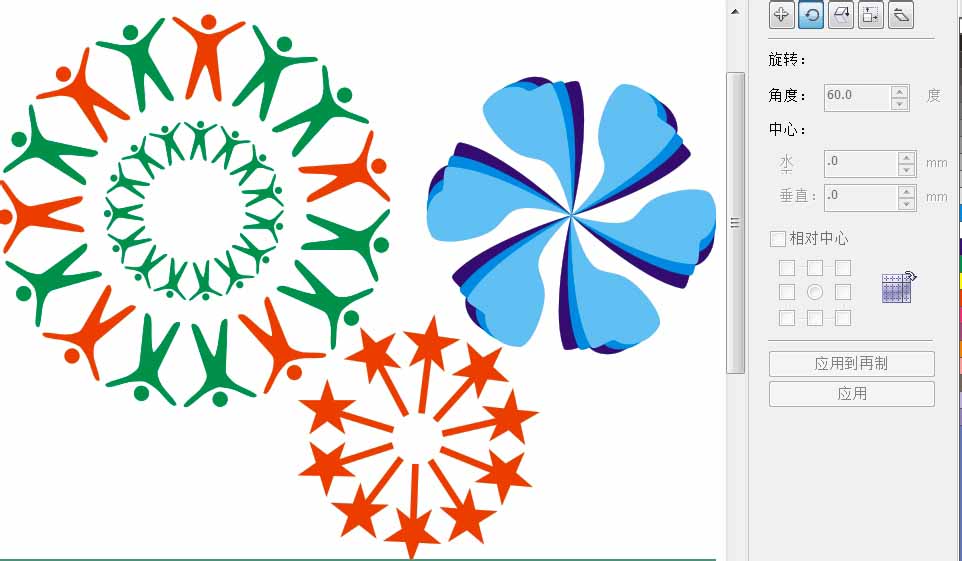 4、以360度为单位,你想要多少个小单元算好角度,比如上面24×15=360 这个不用我教吧,重复点击应用到再制,直到转成一个圆形图案。