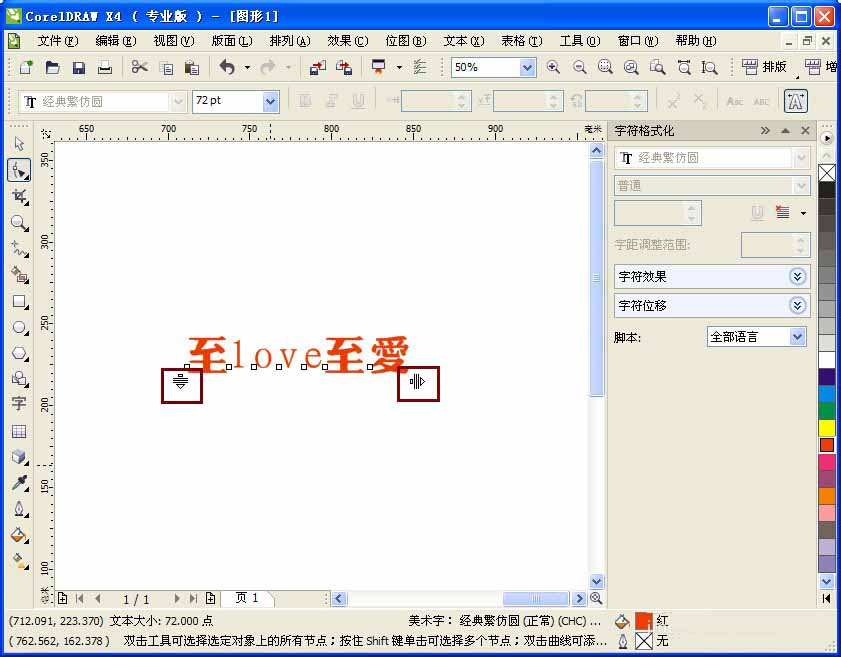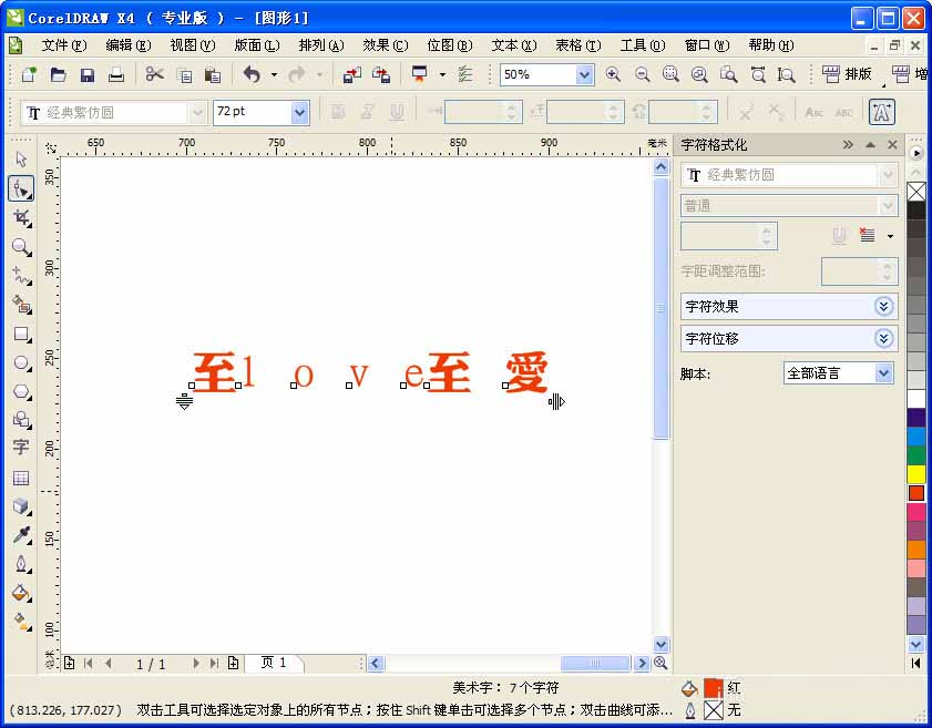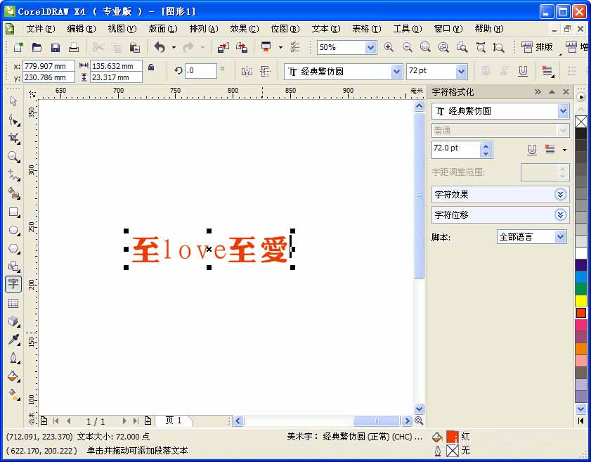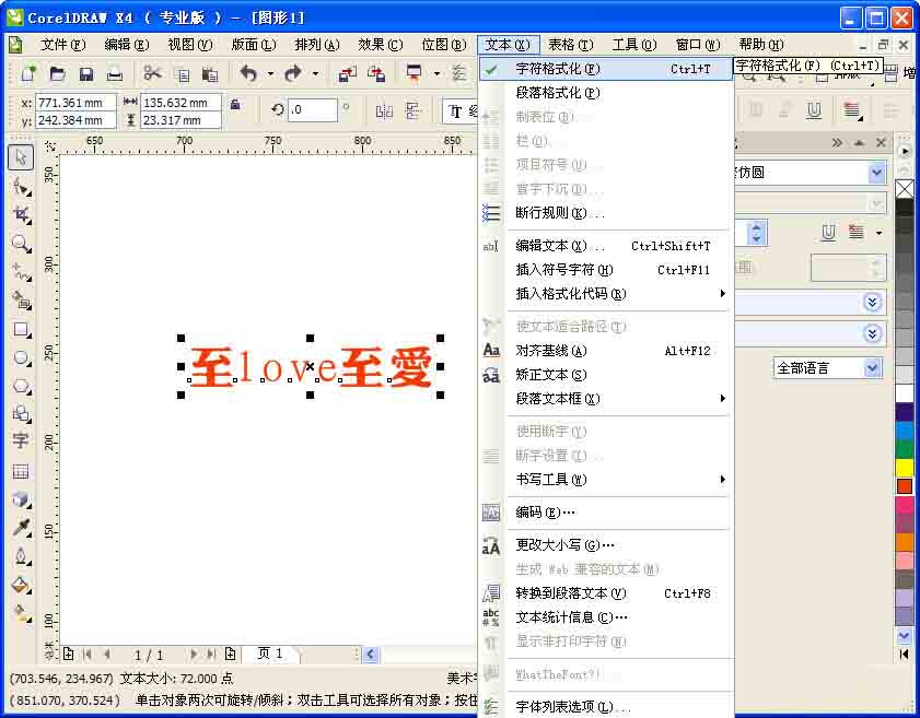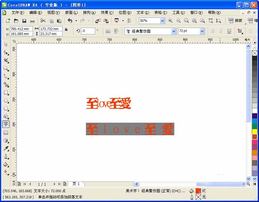 2、选择“文本工具(F8)”输入文字“至love至爱”,如图,