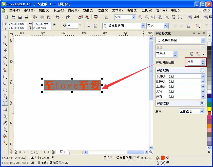 5、“字距调整范围”设置。首先文本工具选中文字,“字距调整范围”方可使用。如图,