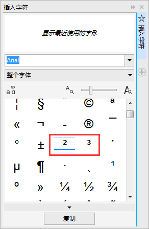 2. 在界面右侧会弹出“插入字符”面板,拖动滚动条,找到下图所示,角标字符。