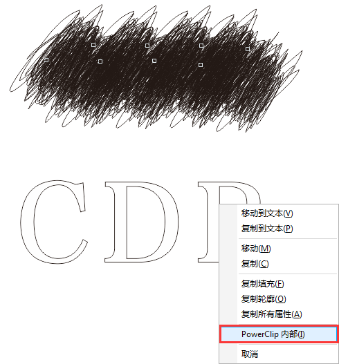 3. 水平复制多次涂鸦线条,以覆盖文字,选择所有复制线条Ctrl+G组合对象,选择涂鸦线条按住鼠标右键拖拽至文字中,释放鼠标。在出现的快捷菜单中选择“PowerClip内部”命令。