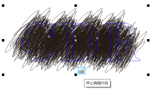 4. 此时的涂鸦线条就会精确剪裁至字母内部,若不是想要位置,可选择编辑PowerClip按钮,出现蓝色线条边框时,线条被全部显示,画面在图框中可任意移动,在完成对图框精确剪裁内容的编辑之后,点击图框下面的“停止编辑内容”即可按照调整的位置显示内容。