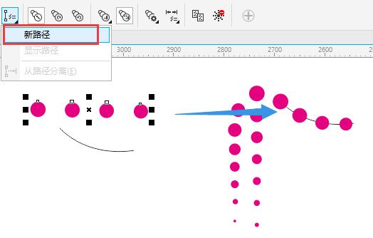3. 继续复制小圆调和图形,绘制曲线路径,选中调和后的图形,单击属性栏中的“路径属性”,中的“新路径”选项。当鼠标变成一个粗大弯曲的箭头时点击曲线路径。