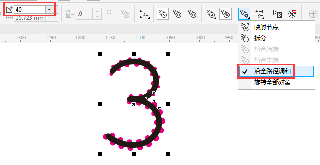 7. 然后沿全路径调和,也可以通过拖拽两端的原始图形以调整位置和间距,设置调和步数为40,如图所示。