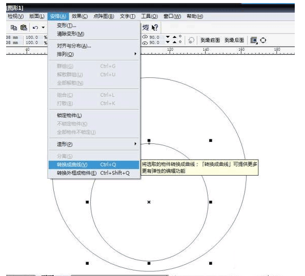 2、移动中间小圆,注意按着ctrl移动,保持垂直。 将圆转曲,方便之后变形,变形如图,也可以直接用快捷键ctrl+Q。