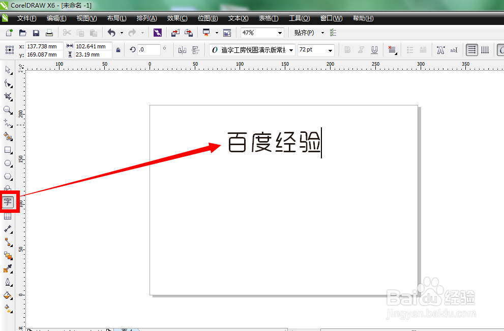 1、首先,使用文本工具,随意输入一个文字内容,比如“百度经验”四个字