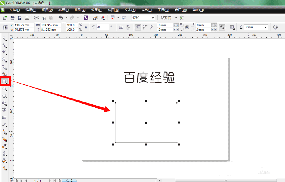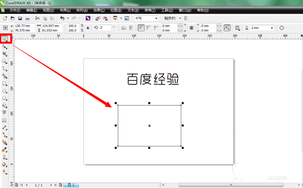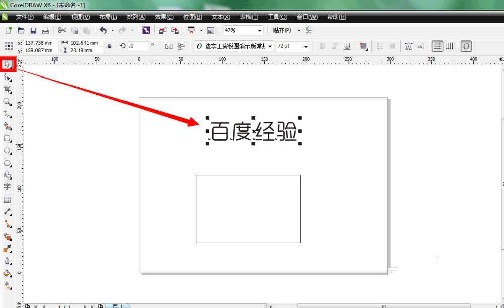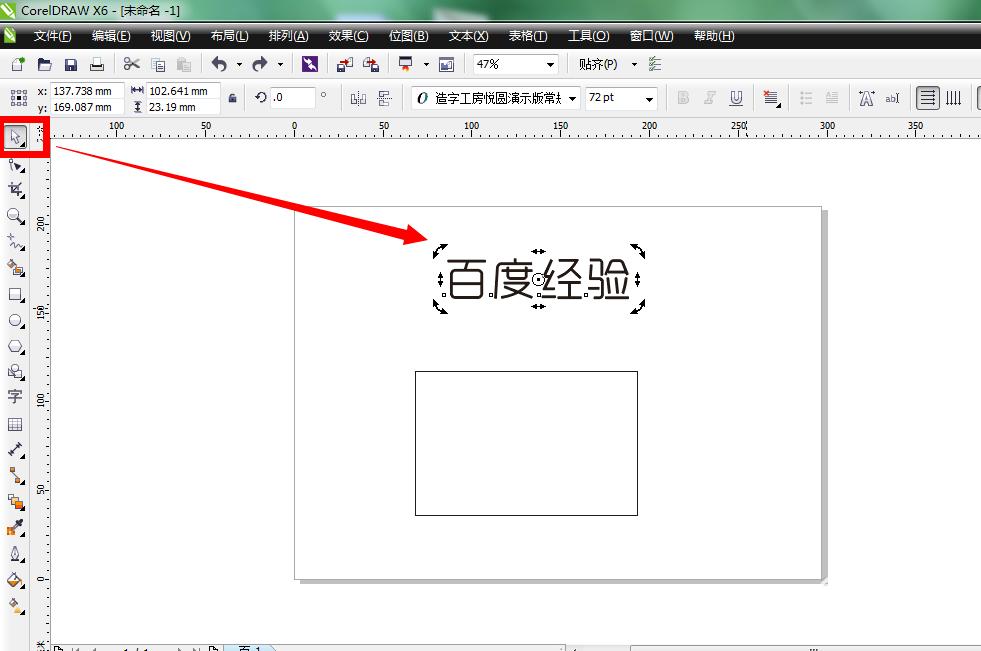 3、我们使用选择工具,单击文字或者矩形,文字、矩形都是仅仅处于被选中的状态而已