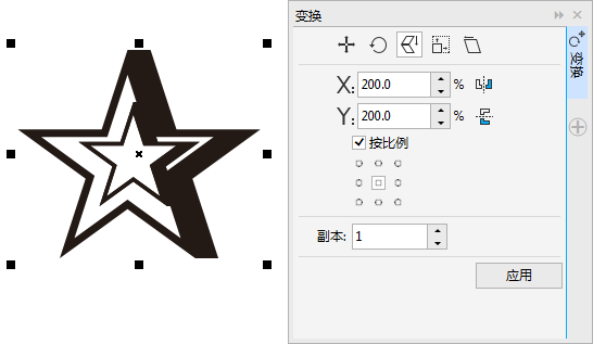 按比例复制对象即CorelDRAW中的缩放功能,能够精确地调整对象的大小及对象之间的相对位置,具体方法是选取对象后,执行菜单栏“泊坞窗口>变换>缩放与镜像”命令,按照要求调整面板的设定值,然后按下“应用”按钮即可。