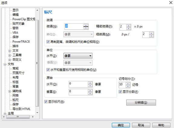 单击“工具”→“选项”命令,在弹出的选项对话框的左侧选项栏中,单击文档标签,接着单击标尺,在对话框的右侧显示针对标尺标签的一些功能,在微调复选框中输入您想要每次微调对象的距离。精密微调:通过按下Shift键和箭头键来大幅度递增移动对象。精密微调值乘以微调值即可获得对象移动的距离。细微调:以小幅度递增移动对象,设置完成之后单击确定即可。