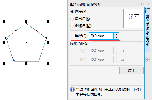 2. 在多边形选中状态下,单击菜单栏“窗口>泊坞窗>圆角/扇形角/倒菱角”命令,界面右侧弹出“圆角/扇形角/倒菱角”面板。默认为“圆角”类型,根据图形大小设置半径数值,作图窗口会根据您设置半径的变化实时预览,如图所示。