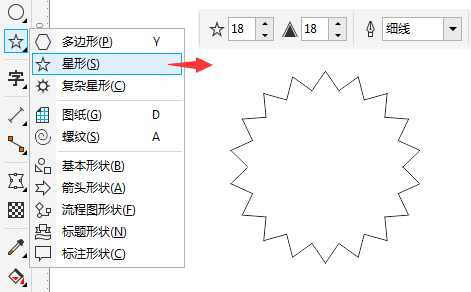 1. 点击工具箱中的“多边形工具”,使用子工具中的星形工具按住Ctrl键绘制星形,并设置属性栏边数和锐角度数,如图所示。