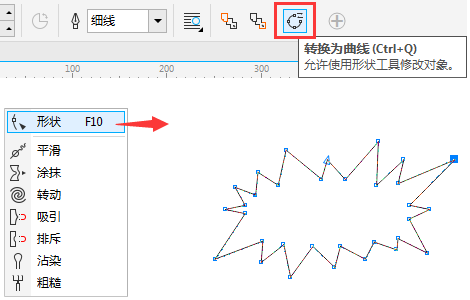 3. 鼠标右键单击此图形执行“转曲”操作(快捷键Ctrl+Q),然后用“形状工具”调整需要变化的节点,适当变换下,这样不会觉得那么呆板,如图所示。