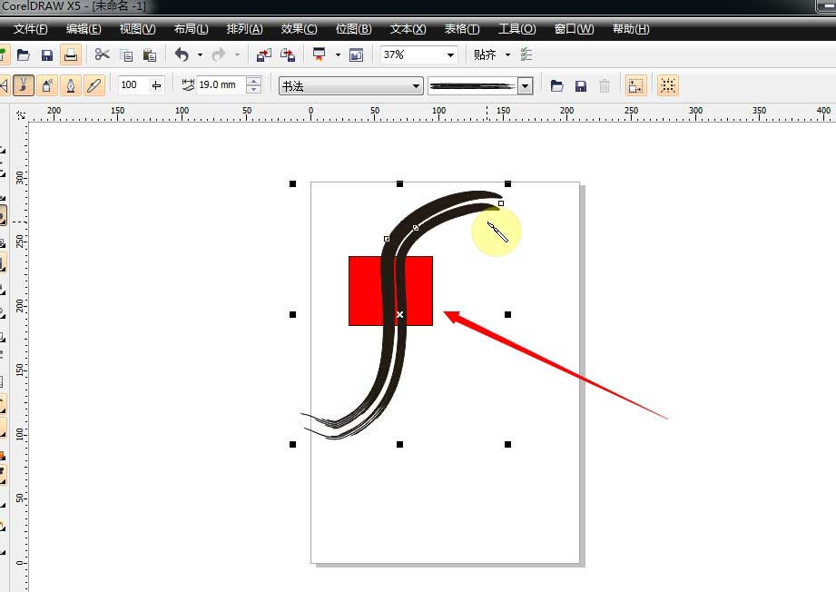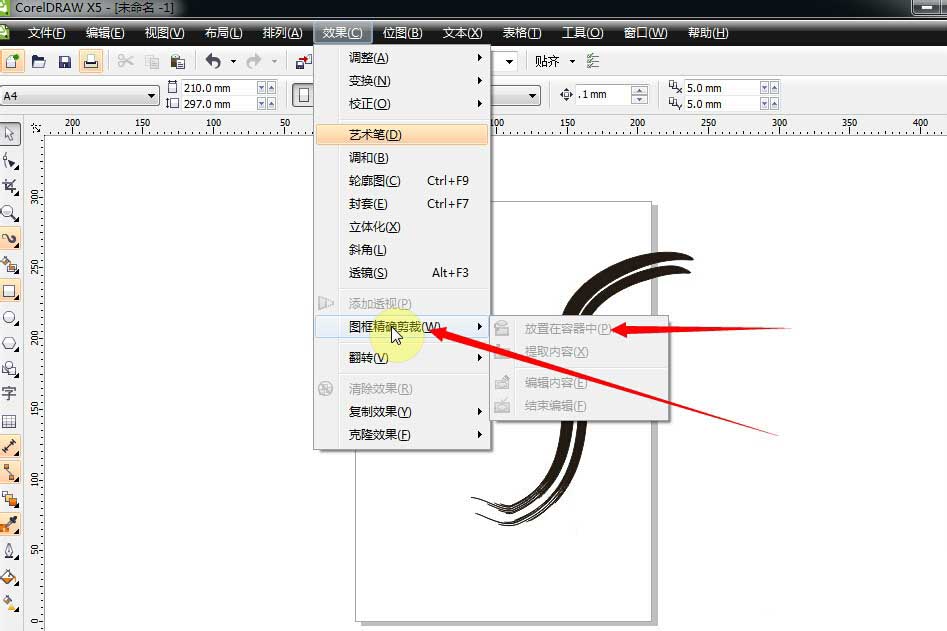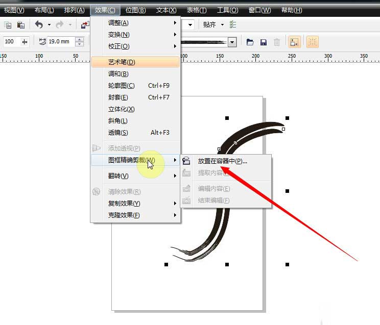 1、打开软件用艺术笔工具画两个图形,把黑色图形装入到方框中