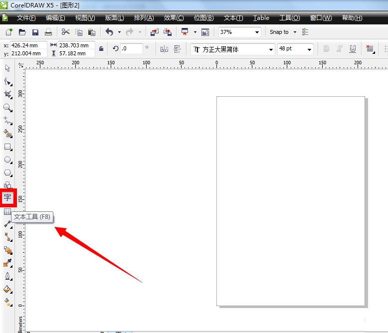 1、启动cdr软件,新建页面以后,在左边的工具栏大概中间的位置上,有个“字”的图标按钮,那就是文本工具。