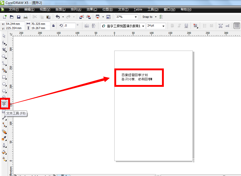 2、单击文本工具,然后在页面空白位置上单击一下,出现闪烁的光标,再输入自己的文字内容,比如现在我们输入“百度经验回享计划”“每次分享,必有回享”两行文字
