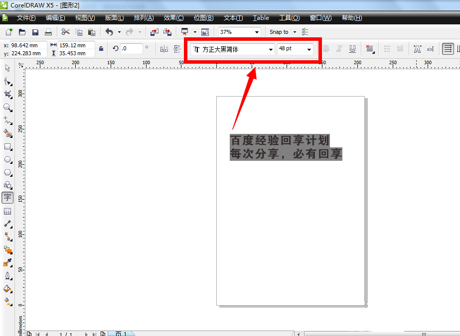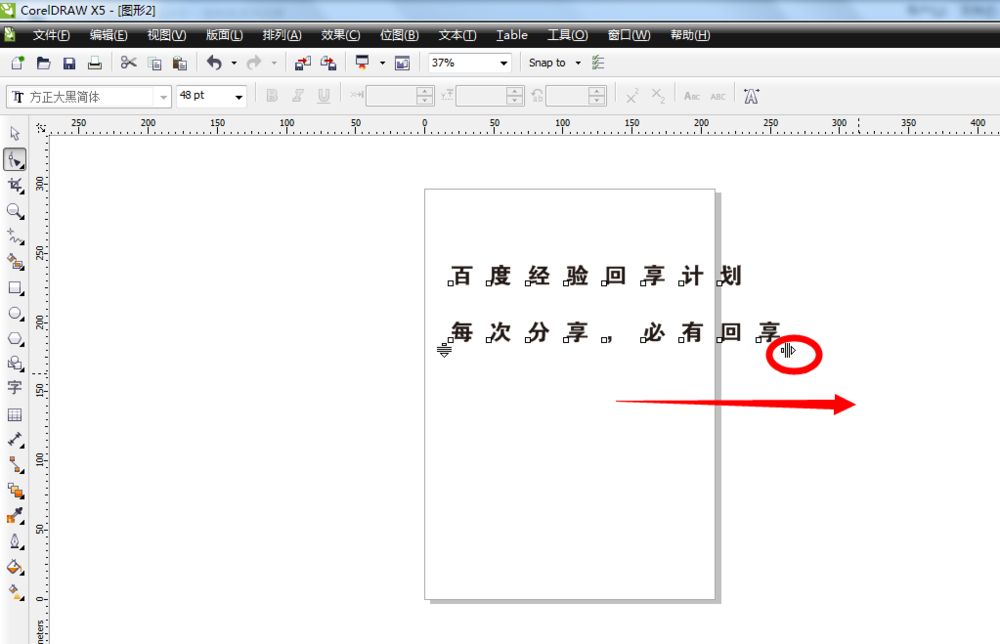 4、修改好文字的字体和大小以后,想要修改文字的行距和字距,怎么办呢?在软件左边的工具栏的上方,用鼠标单击“形状工具”,接着就可以看到页面上的文字左边和右边都有一个横线加上小三角形的按钮,如图所示