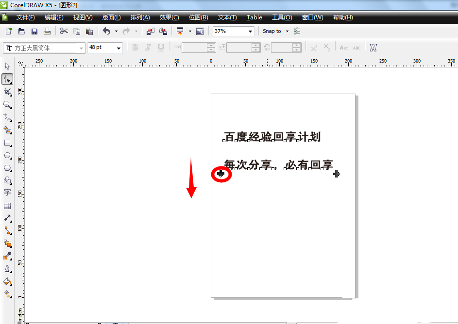 5、使用文字左边的按钮可以修改文字的行距。鼠标拖住文字左边的按钮往下拉,不放手,一直拖到自己觉得两行字之间的距离合适为止再放开。