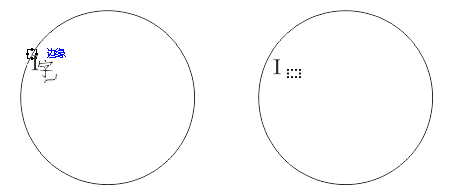 当文本光标在在圆上或圆内时,光标会显示三种状态,上图所示,即为输入文本标志,这个图标,表示可以在页面的任何位置添加美术字和段落文本;下图(左)所示,为添加路径文本,文本可以输入到自定义的图形轮廓线上去,使文本沿着轮廓线的走向排布;下图(右)所示,是可以将段落文本添加到对象内部,将指针置于该对象的内边框上,然后在指针变为插入光标时开始键入内容。