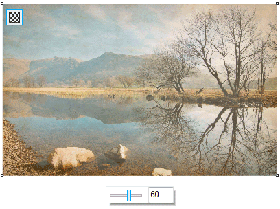 方法一、将“旧纸张”图片放置在风景图片的上层,使用透明度工具,应用显示对象下层的图像,并调整透明度数值。