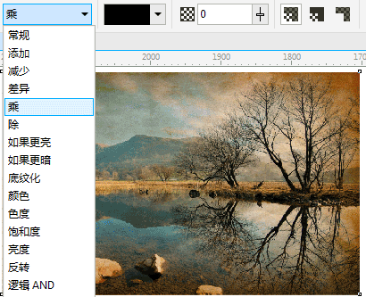 方法二、依然使用透明度工具,设置其属性栏中的“合并模式”,单击右侧黑色三角号,选择“乘”模式。CDR中的合并模式类似于PS中的图层混合模式,如:“标准模式、叠加模式、柔光模式”等等。