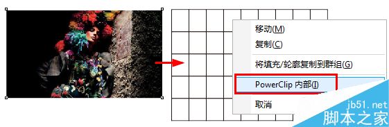 步骤2:找到工具箱中的图纸工具,并且先设置好图纸的行数、列数。必须是先设置后绘制才可以。然后将图片按住鼠标右键拖拽到图纸中,在弹出的快捷菜单中选择“PowerClip内部”命令。