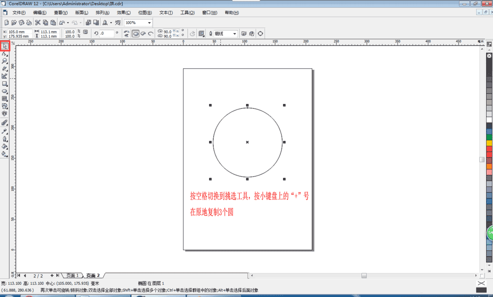 3、按空格键切换到挑选工具,并按小键盘上的“+”号,在原地复制三个圆。