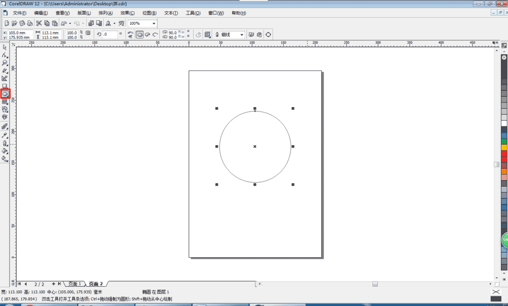 2、打开coreldraw软件,新建一个文件,单击工具箱中的椭圆工具,或者按快捷键F7,按住ctrl键,同时按住鼠标左键拖动绘制一个圆