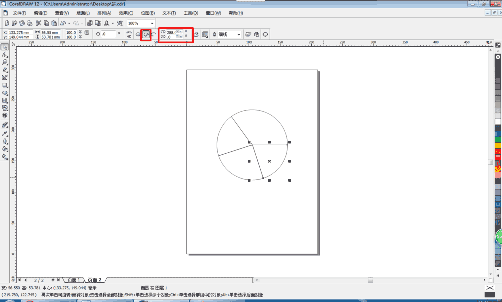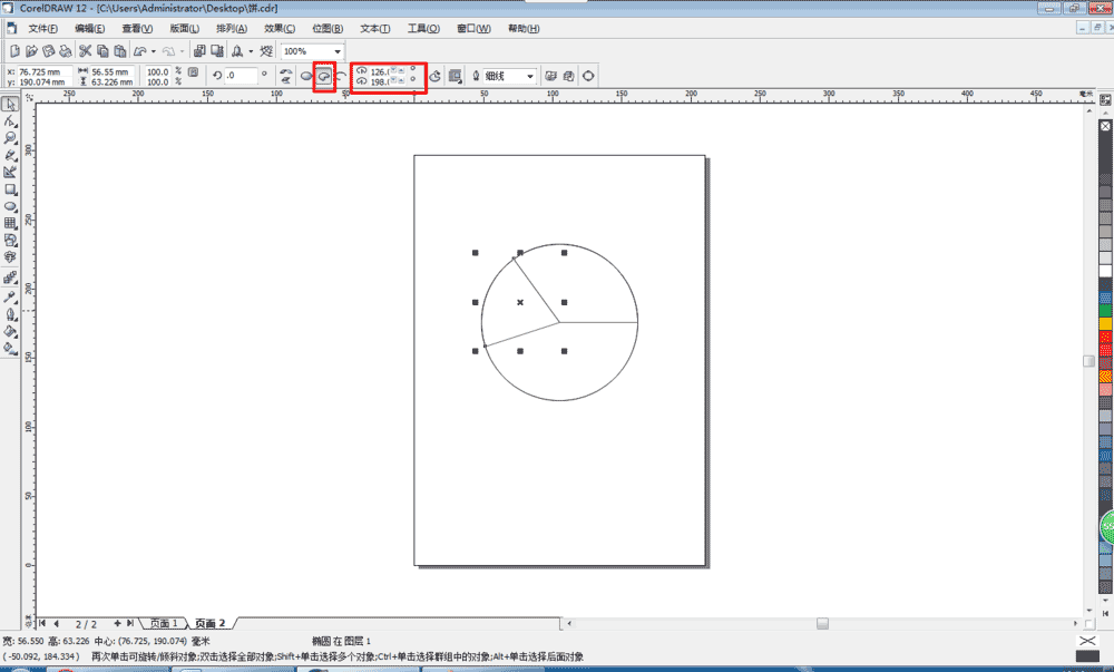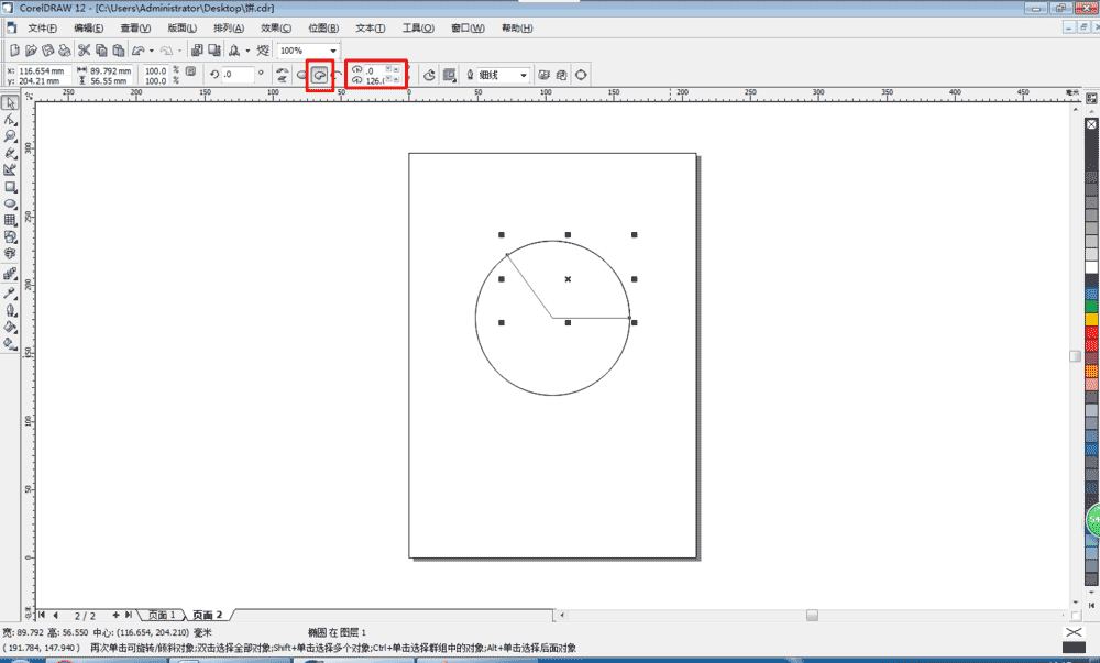 4、单击选择一个圆。点击属性栏上的饼形,设置起始角度为0,结束角度为126。
